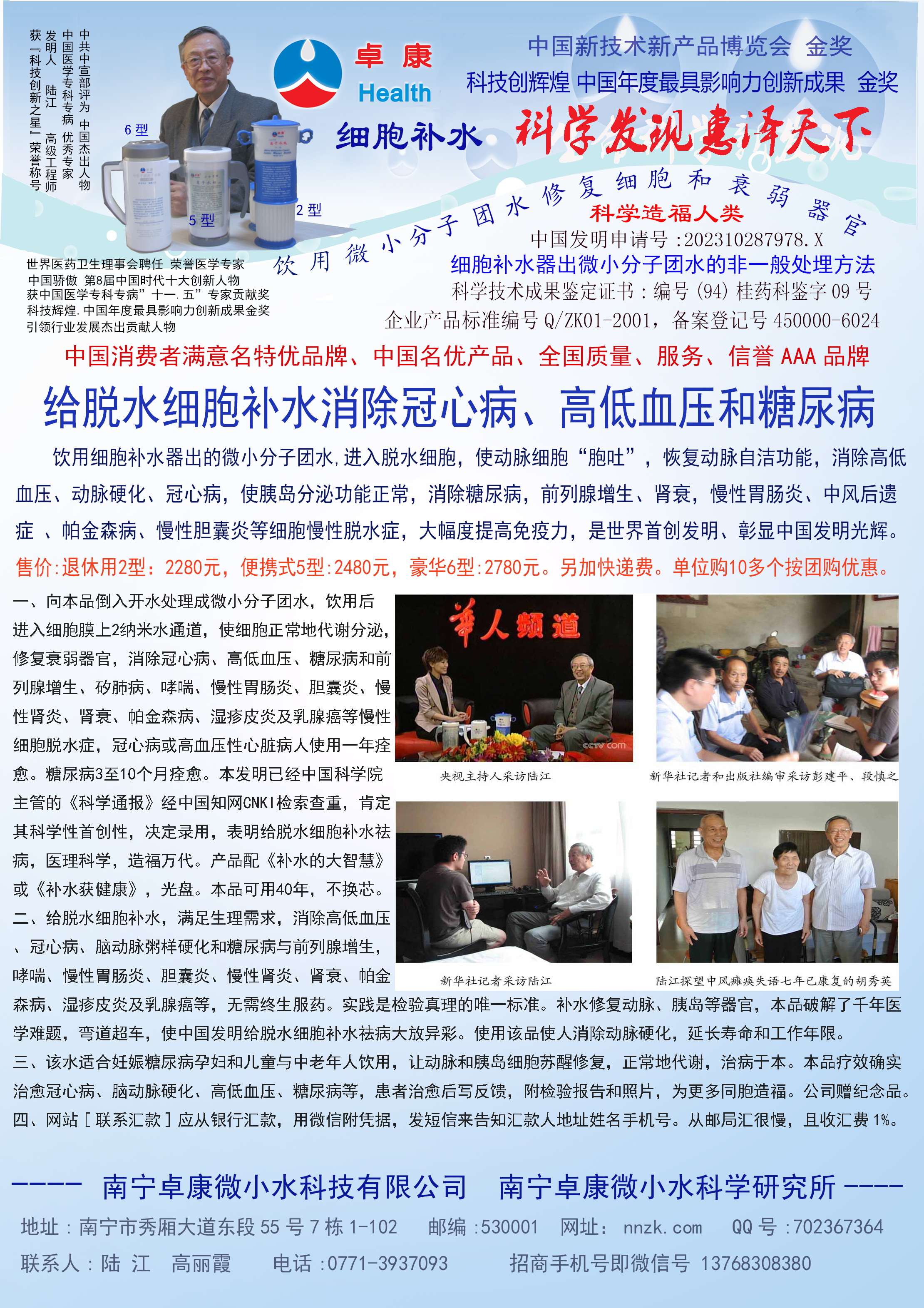 - -- 幾千年來,人類靠醫藥不能根治冠心病、高血壓和糖尿病,如想根治,那是夢想??墒?,我從中國基礎醫學研究成果受到啟發,研發了一種發明產品,處理出微小分子團水讓人飲用,實現了人類這一夢想!患者飲用后遠離了冠心病、高血壓和2型糖尿病。這一成果曾經過臨床試用和專家鑒定,作為準字號醫療器械讓廣大患者飲用,療效進行跟蹤調查。很多患者的反饋情況令人感動,我放在公司網站上(nnzk.com),震撼了醫學專家,也使廣大同胞受到啟發。人們盼望飲用它給細胞補水,治愈多種病癥,既省錢,又安全,而且延長壽命。